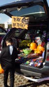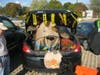 Two cars came dressed as monster faces showing a mouthful of teeth. "Boo to You" featured enormous yellow cat-like eyes and ghosts for ears. Its trunk or treat designer opted to offer individual treat bags of apples rather than candy.
