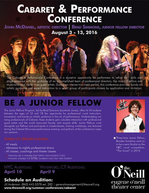 Those interested in the Junior Cabaret Fellows Program can get more information online here. For additional questions, contact Jill Anderson, General Manager, at (860) 443-5378 ext. 290 or e-mail generalmanagement@theoneill.org.