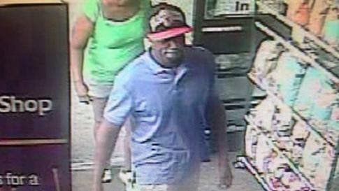 The footage from the surveillance camera shows an African-American male wearing a blue polo shirt, khaki pants and a black baseball cap with a red brim and writing across the front.