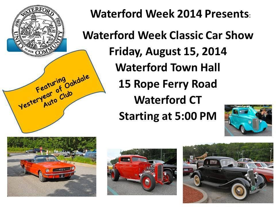 Waterford Week starts Friday, August 15, with a classic car show at 5 p.m. at Town Hall, 15 Rope Ferry Rd. Here is the rest of the schedule.