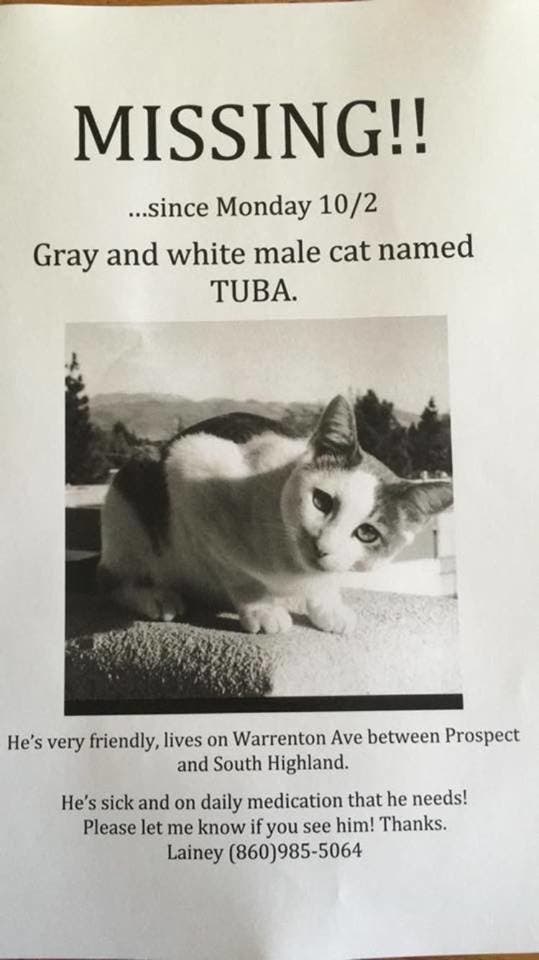 "Tuba" has been missing since Oct. 2 from Warrenton Avenue/South Highland Street in West Hartford. He is a 12 year old, Domestic Short Hair, white with gray patches cat, according to the animal control. He needs medication.