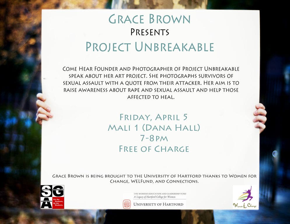 Women for Change, The Women's Education and Leadership Fund and Connections Wellness Center at the University of Hartford bring Project Unbreakable to campus (Dana Hall, room Mali 1). Project Unbreakable, started by Grace Brown, is an art project aimed at healing those affected by rape and sexual assault. Photographs are taken of survivors with a quote from their attacker.