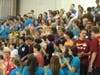 Two upper-class leaders are assigned groups of 8-10 freshmen who are divided up by homeroom assignments. The first day of Link Crew Orientation includes "play to teach" activities, many of which involve music, funny hats, beach balls, and other props. Freshmen learn about the school and each other, through team juggling, playing "64 squares," and other bonding activities. Upperclassmen are even asked to share a personal struggle with their groups.
