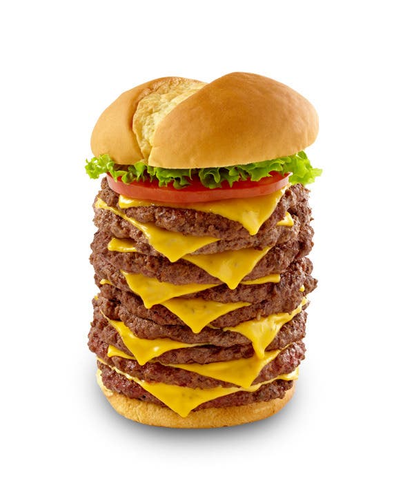 The Triple Triple is a colossal two-pound burger with nine patties and nine slices of cheese all between two buns.