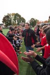 Hundreds of athletes then formed two long rows, side by side, stretching from the stage at midfield and curving down the field. Escorted by KO-KO the mascot, Bisgaard then jogged between the two lines, high-fiving and shaking athletes’ hands on his way to the stage.