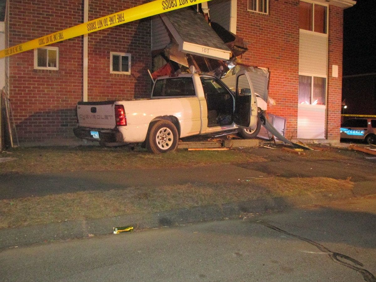Police said a 2006 Chevy Silverado was traveling north bound in an apartment complex driveway when it left the travel portion of the driveway and crashed in to the front of 107 Hillcrest Avenue. The front of the occupied apartment building was hit by the vehicle, according to a release.