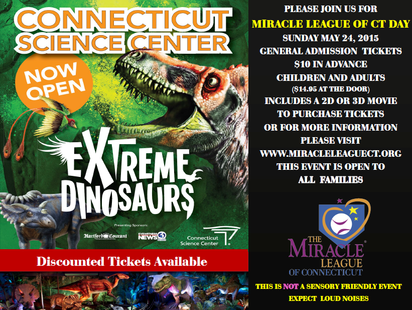 The Miracle League of CT is hosting “Miracle League Day” at The Connecticut Science Center on Sunday, May 24th. Join us for a day of family fun and see the Extreme Dinosaurs exhibit at the museum. We are offering deeply discounted all day passes for the event and it is open to all friends of The Miracle League and to the general public. Tickets are $10 per person in advance, and $14.95 at the door on the day of the event. This is a savings of more than $50 for a family of four.