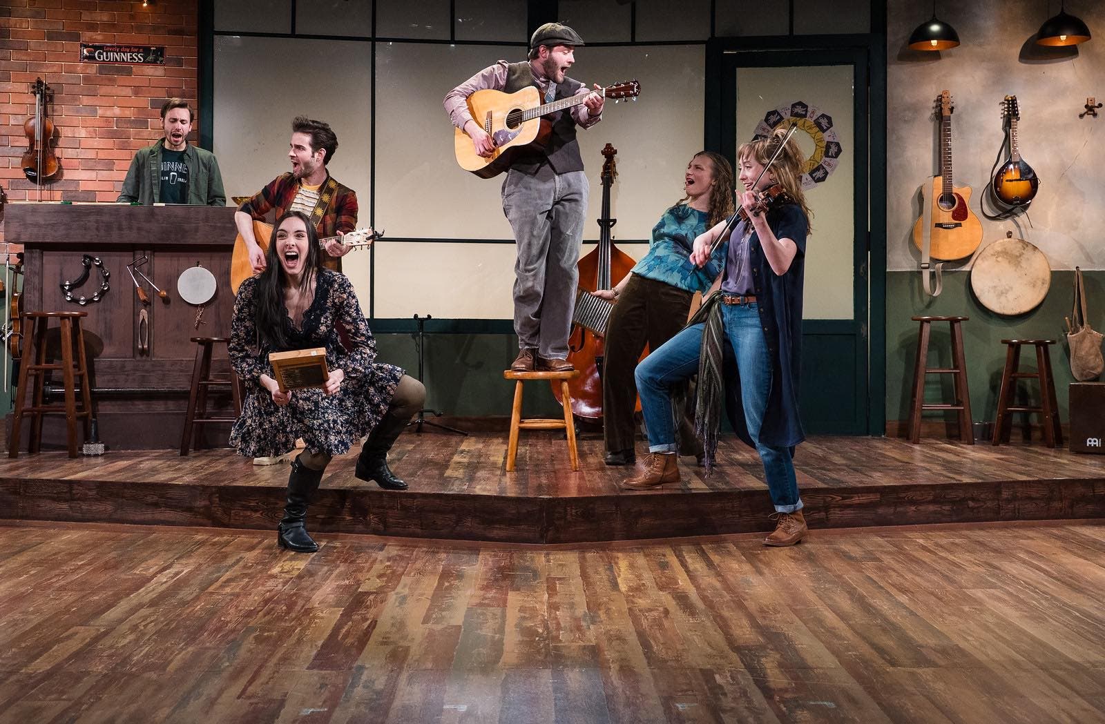 Costumes designed by Vilinda McGregor are casual and cute. Scenic Designer Omid Akbari decorated the two posts at the corners of the stage to look like the walls of an Irish pub, and the back of the stage to look like a stage. The multitude of musical instruments played by the musicians are perhaps the best set decoration. Lighting that was designed by David De Carolis has some lovely effects.