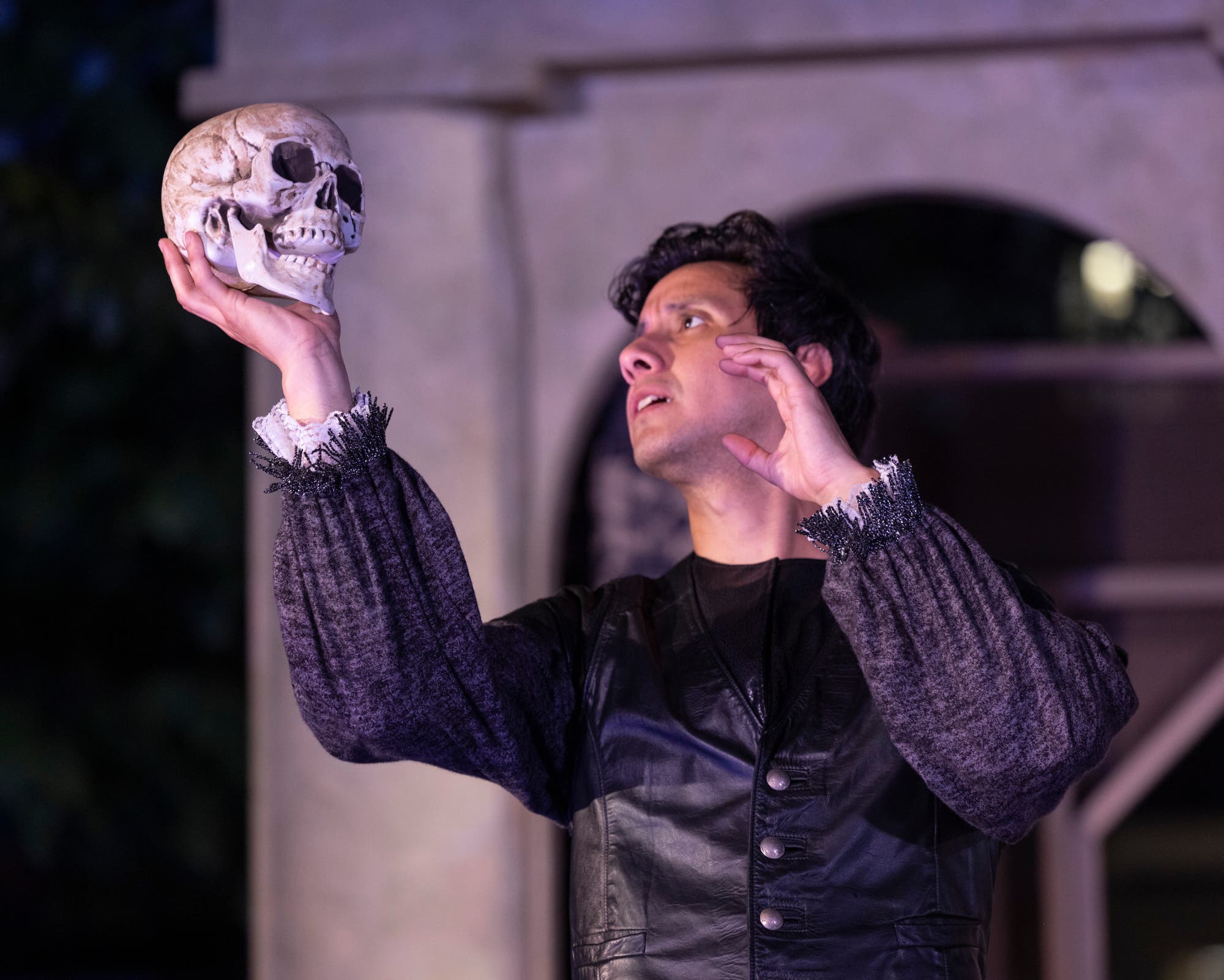 I was able to review the outdoor production of “The Taming of the Shrew” last week, and this week returned to West Hartford to take in an indoor performance of the “Hamlet,” on the stage of the Hoffman Auditorium on the St. Joseph’s campus, with the very talented Equity actor Mauricio Miranda in the title role. The tragedy is directed by Geoffrey Sheehan with Rachel Kiel as stage manager.
