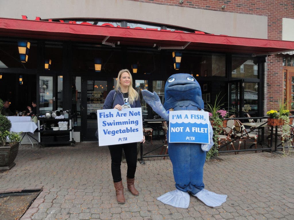PETA's literature, which Hamilton was handing out, states five reasons not to eat fish, including: fishing is hurtful to the fish, fish contain toxic bacteria and poisons such as mercury, fishing is bad for the environment, fish are smart and sensitive, and fish deserve protection just like other animals.
