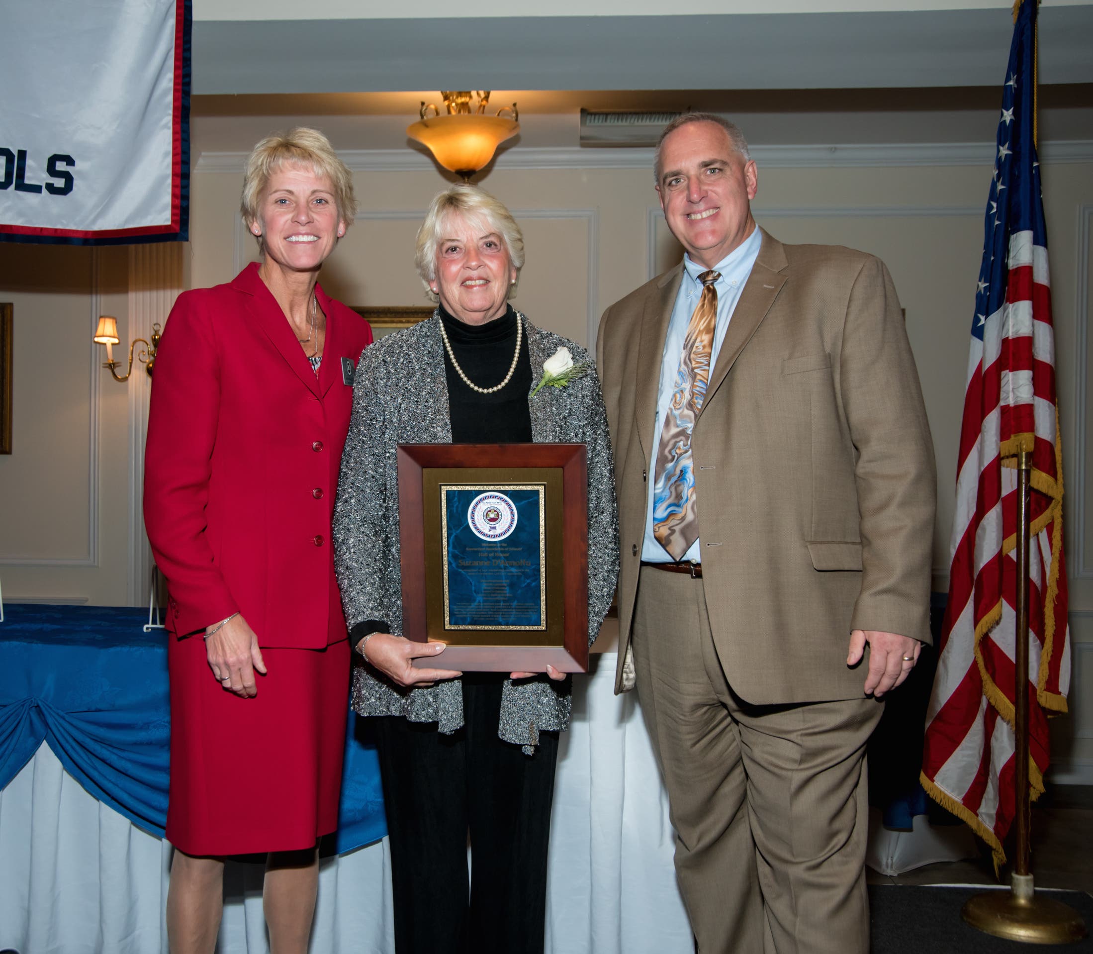 Pictured: (L to R) CAS-CIAC Executive Director Karissa Niehoff, Suzi D’Annolfo, and CIAC Board of Control Chairperson Paul Newton. [Photo credit: G&B photography]