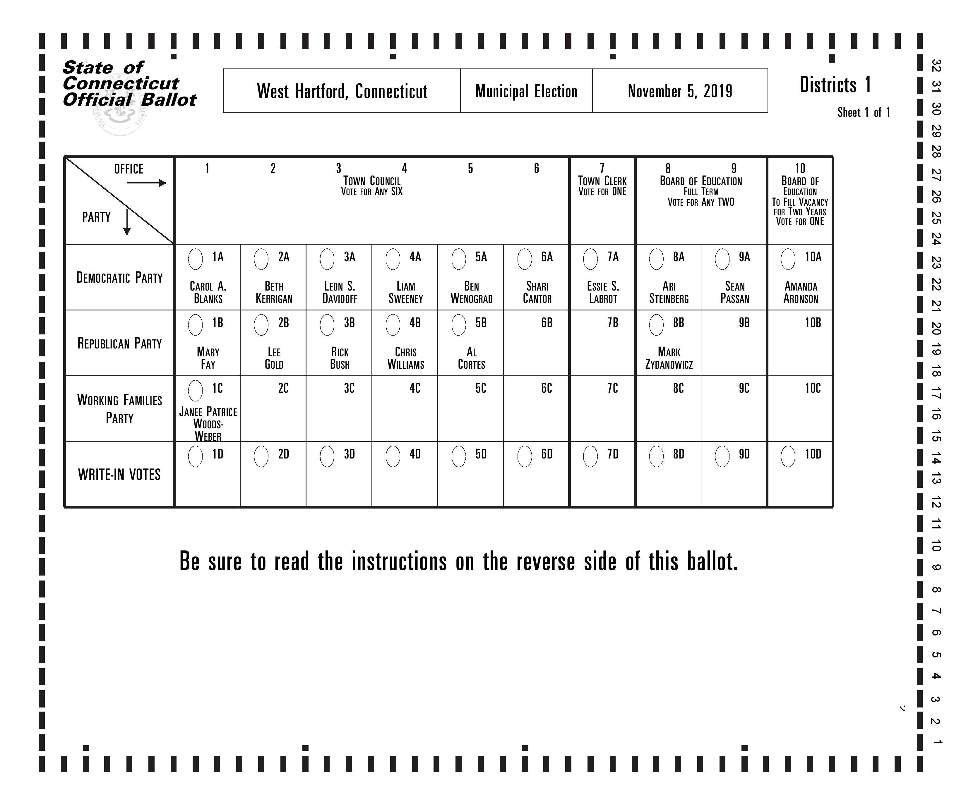 Here is a sample ballot for all elected offices in West Hartford, as provided by the Secretary of the State. Election Day is Tuesday, Nov. 5.