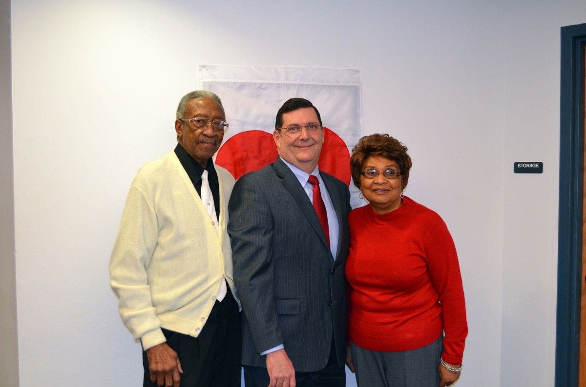 WEST HAVEN, Feb. 14, 2017 — Mayor Edward M. O’Brien, center, joins Frank and Joyce Flegler, of West Prospect Street, during the city’s 27th annual Valentine’s Day party Feb. 14 at the Savin Rock Conference Center.