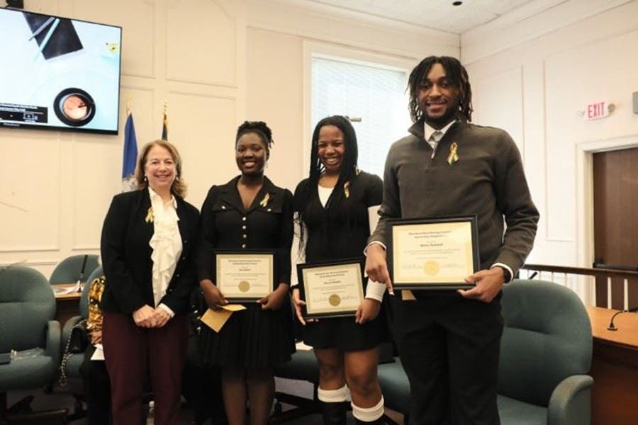 From left, West Haven Mayor Dorinda Borer presents West Haven Black Heritage Committee awards to Hopkins School seniors Vera Okyere and Aurora Chevalier and Notre Dame High School senior Quincy Dormevil, all of West Haven, for “exemplary volunteerism and leadership and outstanding academic and athletic success.” (City Photo/Lindsay Katz)