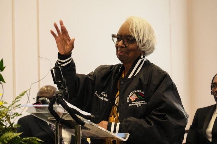 West Haven community advocate Gardenia Dixon waves to the crowd after receiving an embroidered “West Haven Black Heritage Ernestine Jackson Citizen of Distinction Award 2026” jacket from last year’s recipient, youth advocate Levi Jordan Sr., not pictured. (City Photo/Lindsay Katz)
