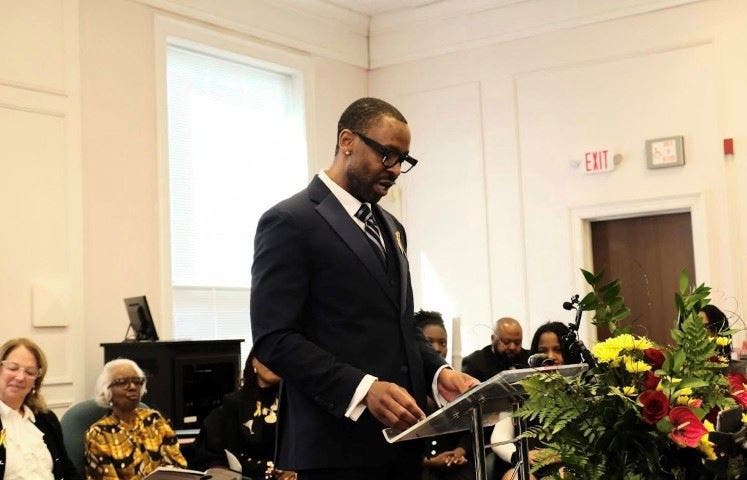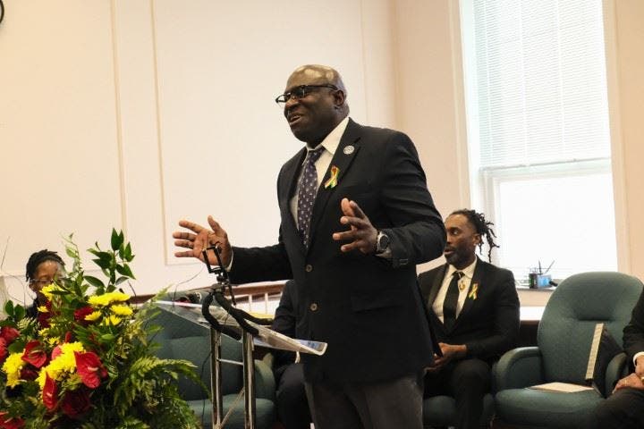 Elder Dr. Renford Whynes of the New Haven Seventh-day Adventist Church gives the invocation. (City Photo/Lindsay Katz)