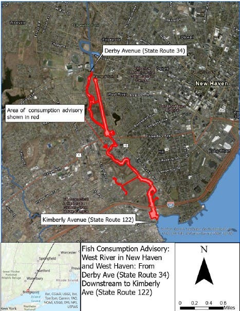 The advisory covers the section of the West River beginning upstream from Derby Avenue (State Route 34) and continuing downstream to Kimberly Avenue (State Route 122). (See map below)