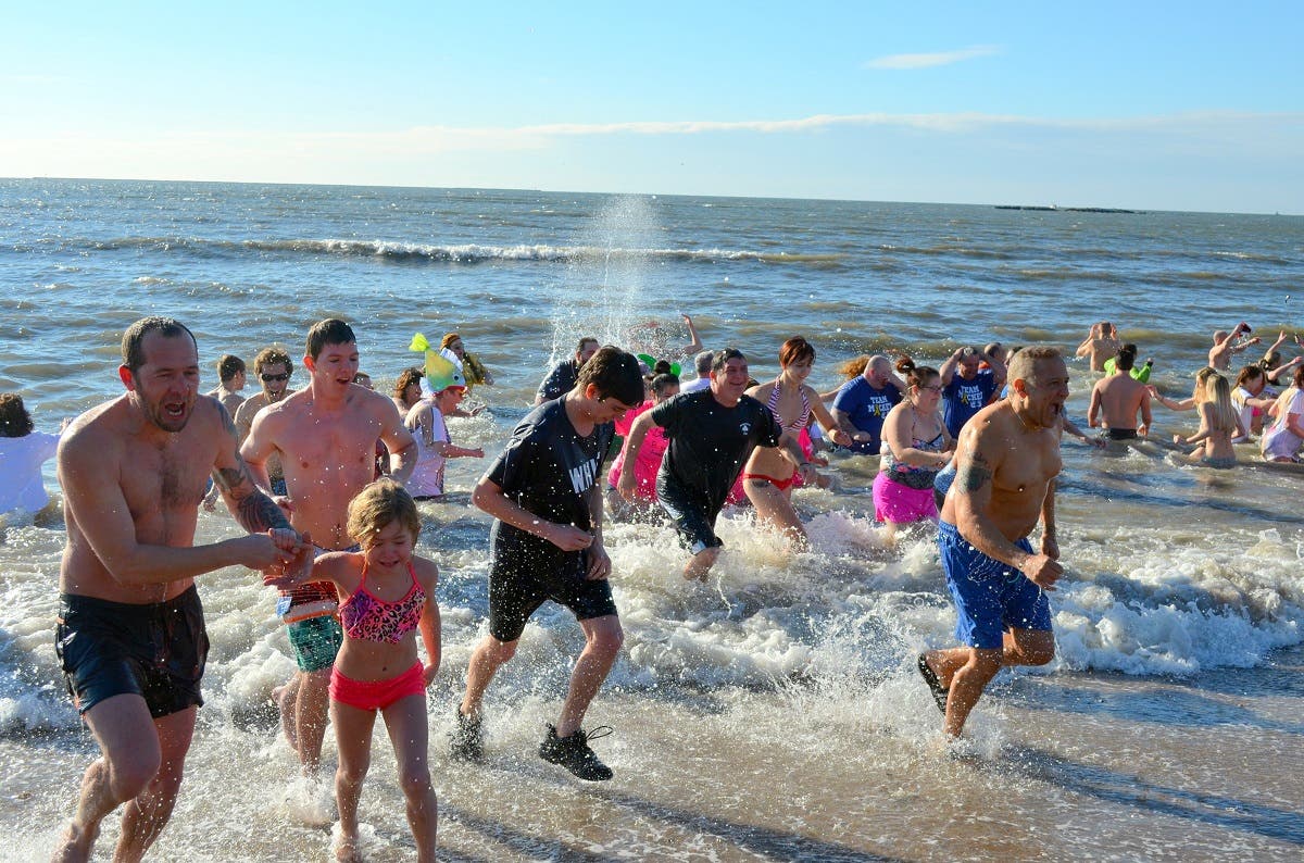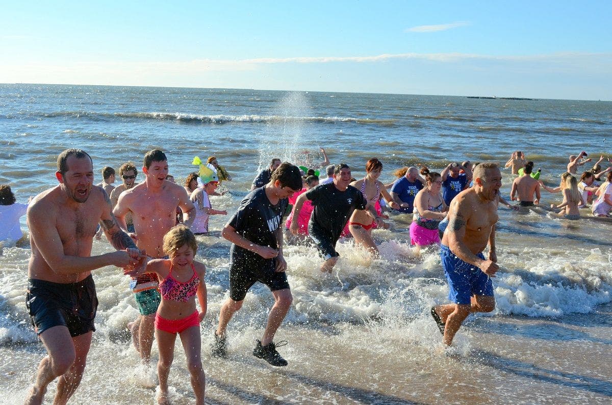 WEST HAVEN, CT — More than 200 intrepid participants — including Mayor Edward M. O’Brien, navy blue T-shirt, and his son, David, WHHS T-shirt — navigate 2-foot swells in the 41-degree water of Long Island Sound during the 17th annual Icy Plunge for the Cure benefit Jan. 28 at Savin Rock Beach.