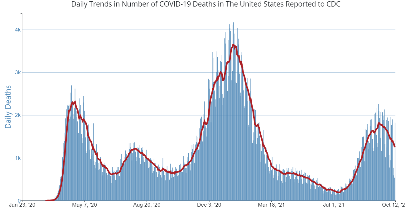 Nationwide, coronavirus-associated deaths have been on the decline since Sept. 16, mirroring Connecticut's own arc. The Centers for Disease Control and Prevention is reporting 1,820 new deaths on Oct. 12, with a 7-day moving average of 1,252.