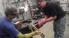 Curtis and his glass partner, Dan Burnstein, use the most primitive of tools — a long metal pipe, a wooden paddle, a bucket of water and wet newspaper, and a metal table with a seat. Four basic elements of the earth - air, water, sand, and fire – are combined to form the glass.