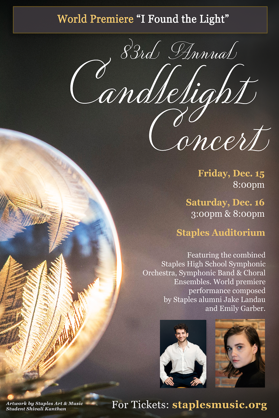 World Premiere - Staples Music proudly announces the premiere of I Found the Light, a commissioned work marking a significant first for the program. This piece, a collaborative creation by Staples alumni, composer Jake Landau (Class of 2000) and poet Emily Garber (Class of 2000), represents a milestone in our commitment to fostering artistic excellence. Upon its release, I Found the Light will be shared worldwide, carrying the distinguished official stamp, "Commissioned by Staples High School, Westport, CT."
