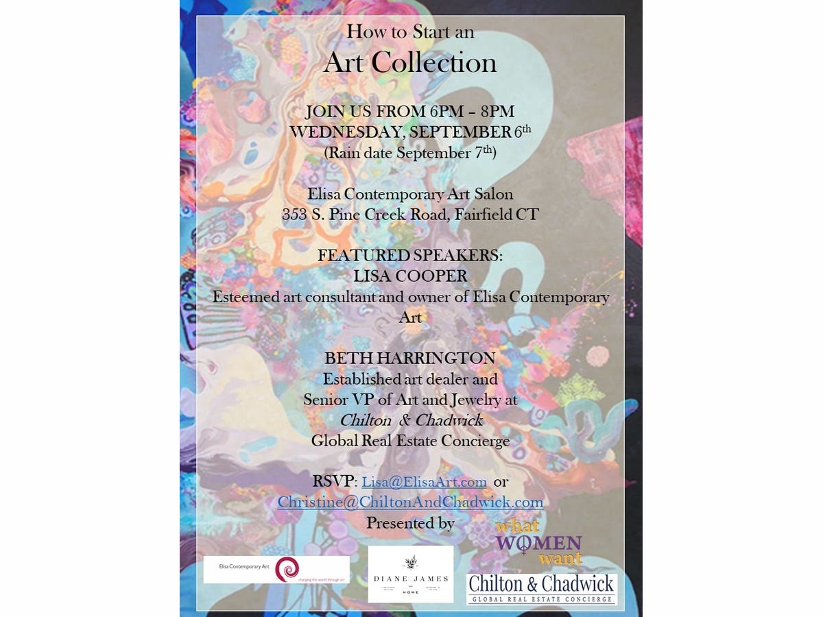 “So many of our members are smart, savvy, successful women in their own rights, but many are intimidated by starting an art collection,” said Christine Finch Oleynick, the head of the Fairfield Chapter of What Women Want. “I think what people will learn on September 6 is that starting a collection is easier than you think, and I can’t wait for everyone to learn from Lisa and Beth.”