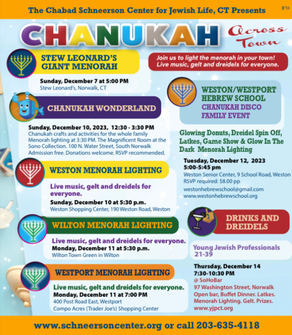 Led by Rabbi Levi Stone of the Chabad Schneerson Center for Jewish Life, CT, the celebration will include live music, in addition to individually wrapped cookies, gelt and dreidels.