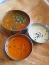 According to the menu, the crepe was to be rolled, but my unrolled version was quite intimidating in its size. Served with two dipping sauces, a tomato sauce and a coconut blend, as well as a small dish of sambar, a piquant vegetable, there was no clear starting point with the half moon-shaped crepe.