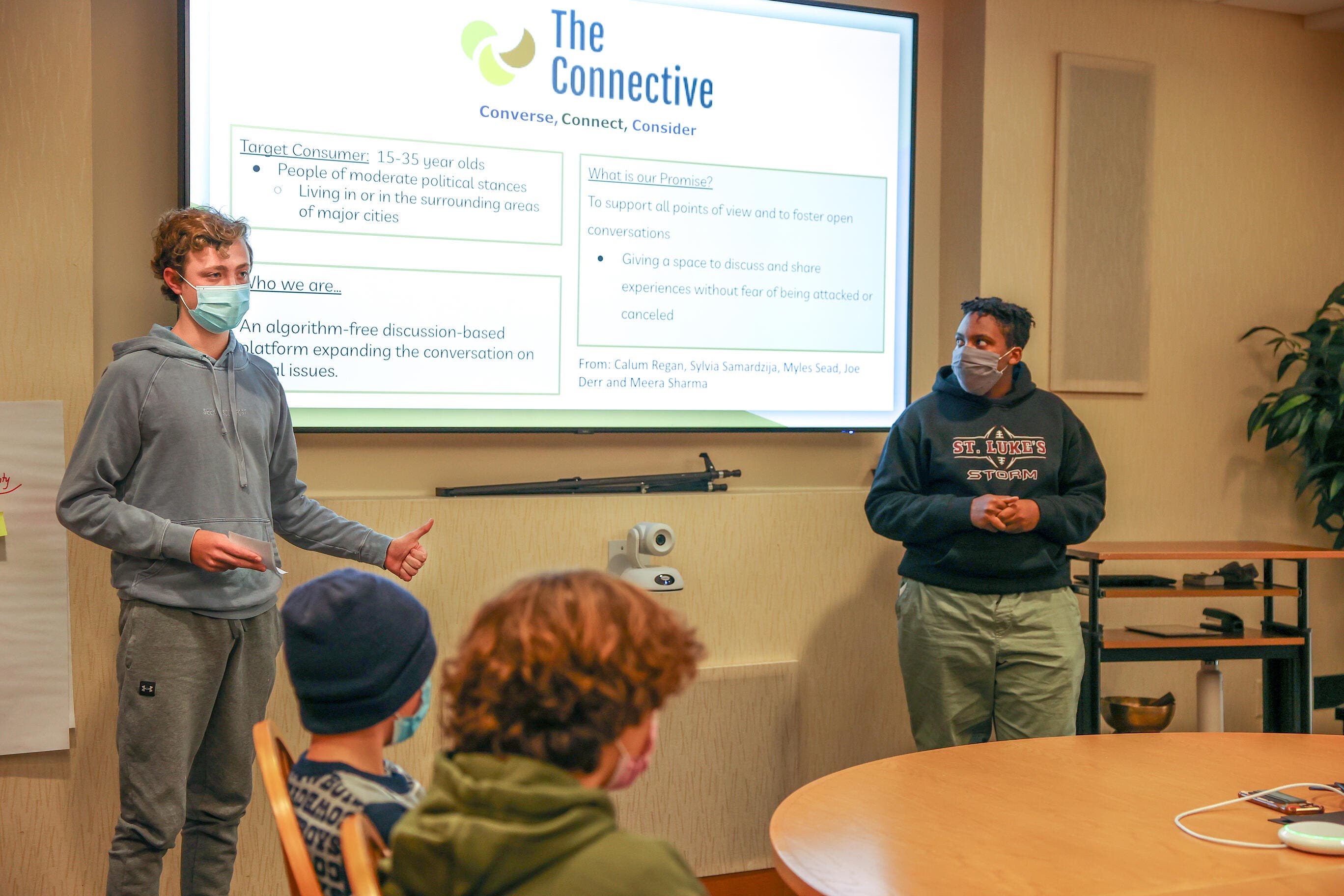 Two days of concept development followed with students mentored by Wearing, Mike Gaumer, the President of Vineyard Vines, and David Pakman, Partner at Venrock and co-founder of Apple’s Music Group. Gaumer and Pakman are also St. Luke’s parents and Pakman is a trustee. Mentors asked clarifying questions, pointed out strengths, and flagged potential problems.