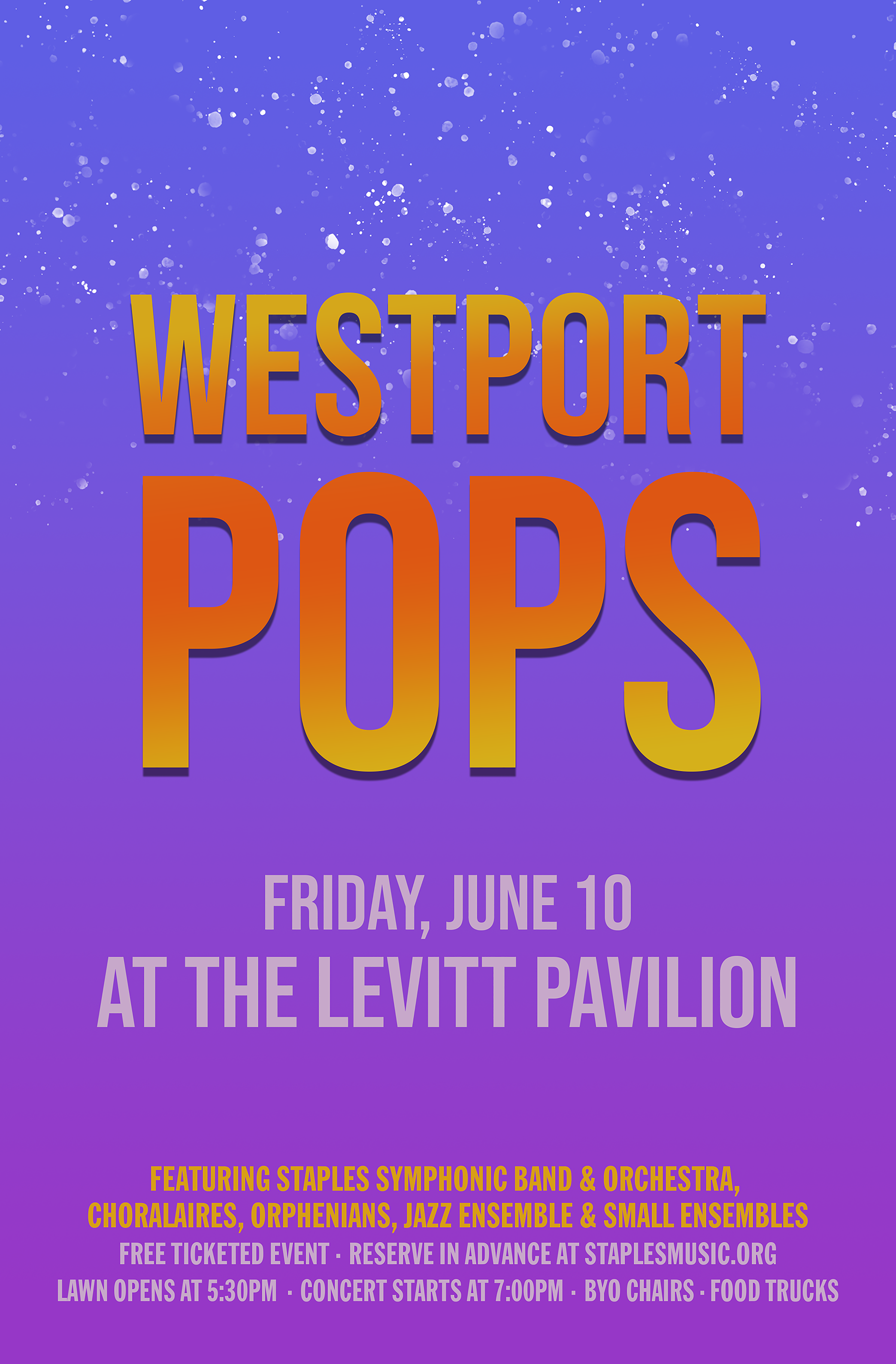 The lawn at the Levitt Pavilion opens for concert goers at 5:30pm (BYO chair), with the concert beginning at 7:00pm. It promises to be a memorable event with great music, great fun and great food on the premises from area food trucks. Tickets are free and can be acquired at staplesmusic.org beginning Wednesday June 2 at 9:00am on a first-come, first-served basis. In the event of inclement weather, the concert will be performed in the Staples High School auditorium at 70 North Avenue, where tickets will be honored.
