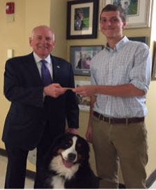 Photo: First Selectman Jim Marpe - and his dog Olivia - receive a Westport dog license from Staples High School student Colter Furman, who is interning with the town. Photo credit: Contributed