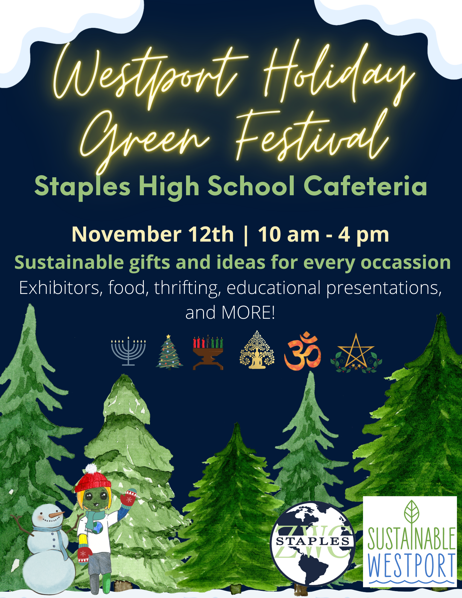 WESTPORT, CT — Join the Staples Zero Waste Committee (ZWC) for our first sustainable holiday festival at Staples High School in Westport, CT on Saturday, Nov 12th. Our mission is to make the holidays a little more sustainable by spreading holiday cheer! The Westport Holiday Green Festival has something for every occasion and holiday. The festival also includes food, kids crafts, gifts to buy, a thrift store, and even more. If you're interested in supporting local sustainability initiatives or want to check out some sustainable gift options for the holidays, stop by the Staples Cafeteria from 10am-4pm on Nov. 12th to support the Staples ZWC, Town of Westport, and the 25+ vendors. Entrance is free and parking is by the Staples Field House and Pool.