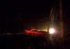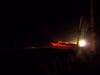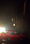 A red Volvo sedan was traveling eastbound on Cannon Road when it veered off the thoroughfare and struck a telephone pole. The impact severed the telephone pole and left the pole and powerlines dangling over both lanes.