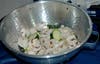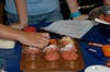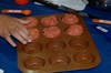 During one session eight middle school girls collaborated on dinner. At one table four girls sliced and chopped zucchini, cauliflower and mushrooms. At another table four girls mixed together ingredients to make personal-sized meatloaves in muffin tins.