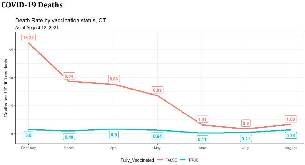 Although coronavirus deaths in Connecticut have declined markedly since February, it is important to note that death — and hospitalization — rates have consistently been higher among unvaccinated persons compared to fully vaccinated persons.