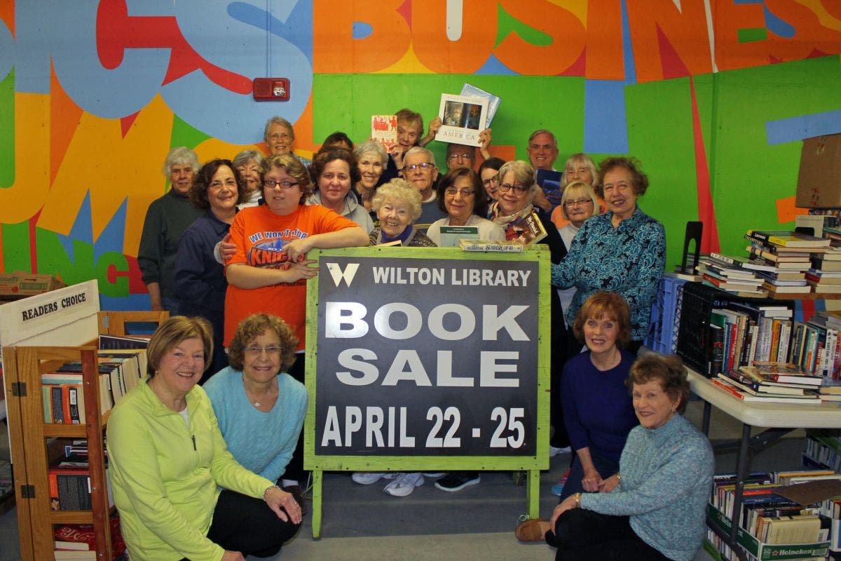 Caption: These happy volunteers are smiling because Wilton Library’s Annual Gigantic Book Sale gets underway Saturday, April 22 through Tuesday, April 25. Photo credit: Janet Crystal
