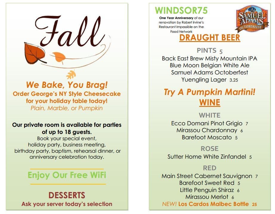 Contact us at 860.925.6256 or find us online at www.Windsor75.com or like us on Facebook https://www.facebook.com/Windsor75Restaurant