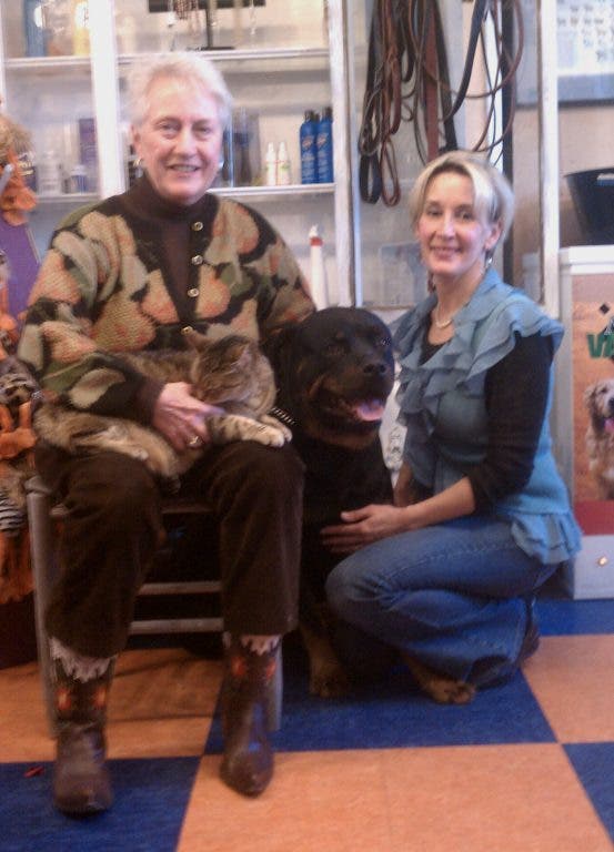 Photographed at the event were Louann Hart (left) of Animals for Life with Lilly, Pet Aesthetics’ kitty on her lap and Pony the Rottweiler; and Pet Aesthetics’ founder and owner, Susan Begasse.