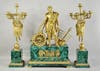 Top lot of the sale was a magnificent French Empire gilt bronze and malachite three piece clock garniture, the central figure depicting “Time” flanked by a pair of angel five-light candelabra. The work, measuring 27 1/4" high, 19" wide to 27 1/2" high, 9" wide, was claimed by an internet bidder at $18,750, winning out against other internet bidders and two phone bidders.