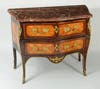 English and Continental formal furniture was featured in the sale, consigned from three different estate collections. A Louis XV rosewood, kingwood and ormolu mounted serpentine commode, stamped "F. Moreau JME", with serpentine marble top overhanging a conforming case veneered in rosewood with kingwood panels having two drawers and embellished with ormolu mounts and hardware, 31" high, 39" wide, 19 1/2" deep, sold for $2,400 to an internet bidder. Selling at $2,685 was a fine George I carved giltwood mirror, the scrolling foliate carved frame enclosing a shaped rectangular beveled plate and measuring 50" high, 33" wide.