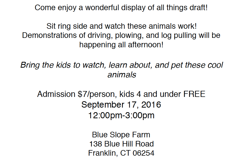 FRANKLIN, CT — Blue Slope Country Museum in Franklin, CT is have a draft horse day, Draft Horse A-Z Saturday, September 17th.