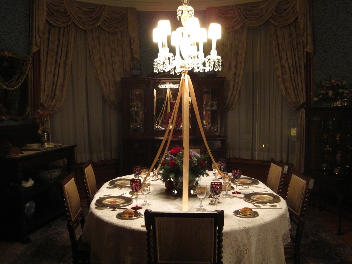 At Christmas, the house takes on a particularly festive look. This year, the woodwork and richly embellished interior will be accented with touches of white, poinsettias, wreaths and several Christmas trees. The rooms on the first floor will be decorated with an array of Christmas trees and greenery. One of the many trees will feature antique ornaments from a private collection while others will be decorated with vintage ornaments from the Society’s collection and antique toys from the Society’s collection will also be on view. In addition, the dining room table will be set for Christmas dinner with the fine china, crystal, silverware, and linens that belonged to Gertrude Fyler Hotchkiss.