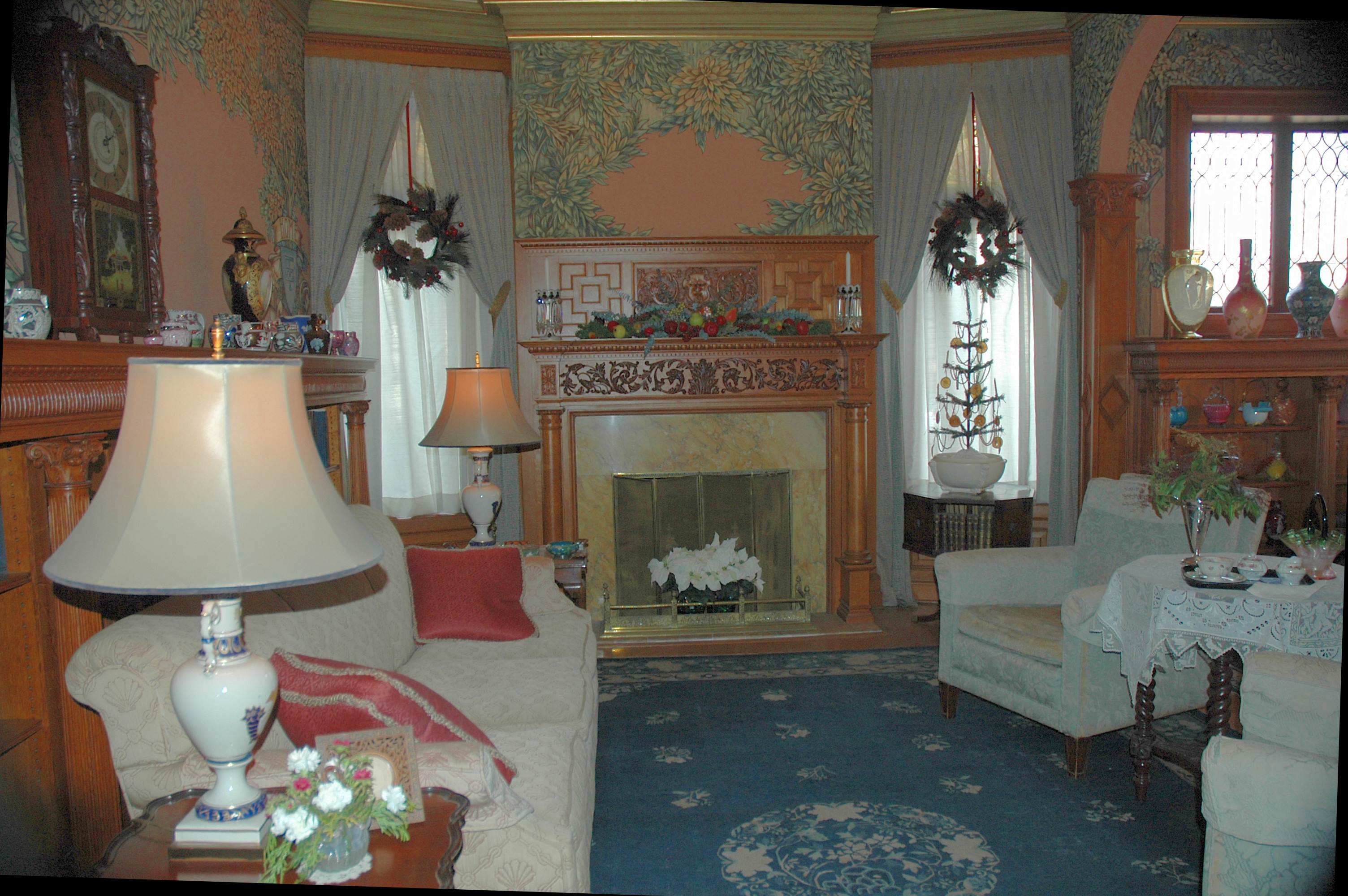 Much of the Christmas decoration is done in turn-of-the-century style with lavish displays of greenery, garlands, wreaths and flowers adorning the staircase, chandeliers, and mantles. This year, several local floral artists have created custom arrangements to set off the home’s rich interior of mahogany woodwork and stenciled walls. Seven Christmas trees, a number of them decorated by private individuals using vintage ornaments from their own collections, are displayed over the first and second floors of the house. Visitors can also view antique toys from the Torrington Historical Society’s collection, arranged beneath the trees.