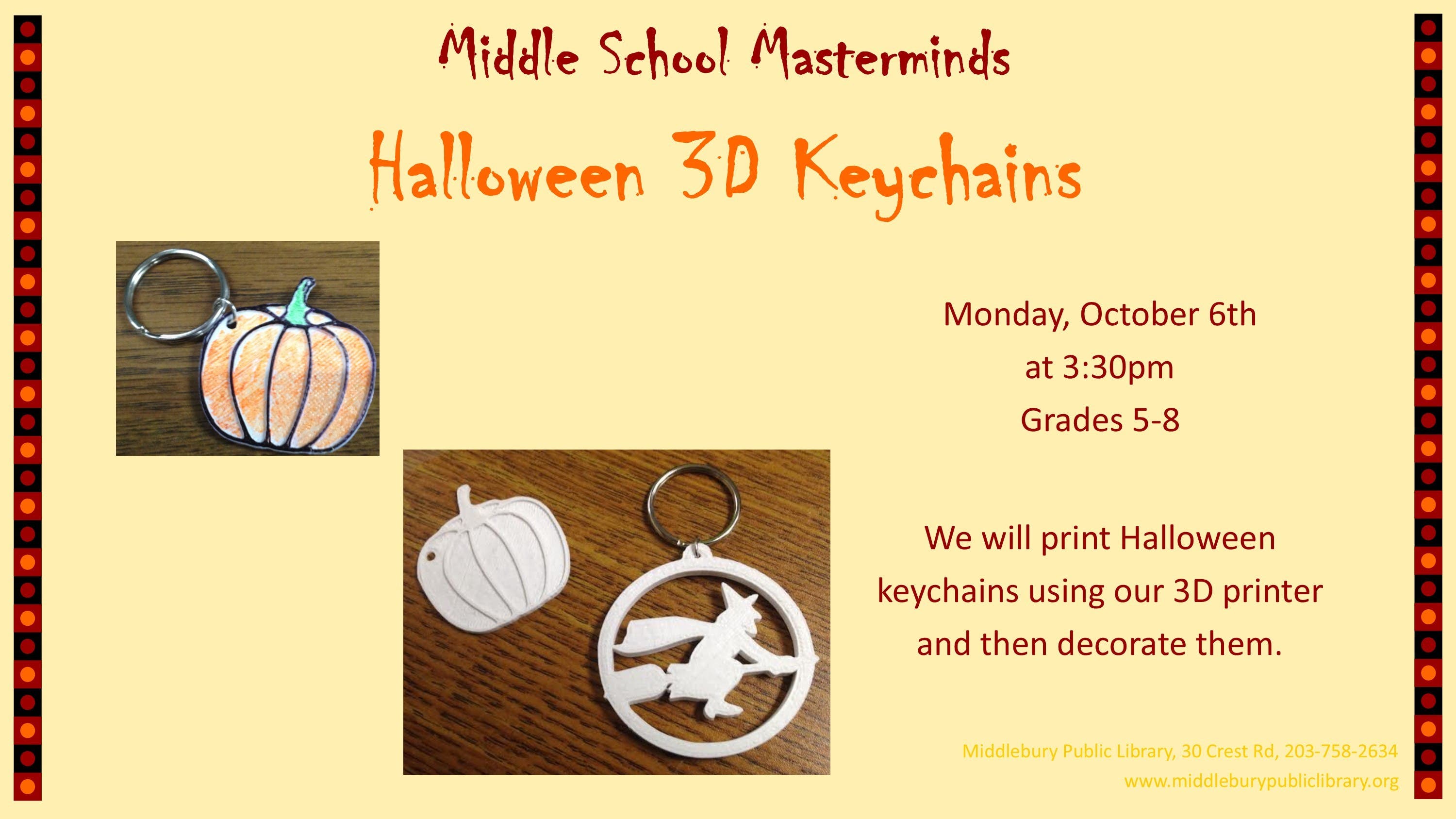Join us Monday, October 6th at 3:30pm for Halloween 3D Keychains. Â We will be printing keychains on our 3D printer then decorating them. Â Call the library at 203-758-2634 or stop by to sign up. Â Grades 5-8.