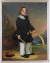 American furniture included in the sale ranges from a New York federal pembroke table to Philadelphia card table, Philadelphia Sheraton chest, and a Philadelphia carved Sheraton four post bed. American folk art items include a large portrait “Boy With Hoop”, oil on canvas signed, dated lower right "S. Perrett Pinxit 1855?" According to the Dictionary of Artists in America (Yale Univ. Press, 1957), there were Perretts working as engravers in Newark, NJ 1860 and after. The painting measures 40 3/4" high, 32 1/4" wide. Other folk art portraits include a portrait of a young girl; folk art portrait of a man; and a folk art portrait of a red haired gentleman.
