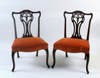Many lots of early English Queen Anne and Georgian furniture are beings sold, many of very high quality although in estate condition having been in storage for many years. The top lots include a fine Queen Anne double dome top walnut and walnut veneer secretary; two George III mahogany butler secretaries, one with elaborate inlays; a rare Continental chinoiserie decorated pitch pediment secretary with slant lid and bracket feet; a rare Queen Anne figured walnut two part high chest; several period stands and tables; two sets of period George III dining chairs; a Regency two pedestal figured mahogany dining table; a fine pair of inlaid George III knife boxes; a rare W&TM Bardin "New British Terrestrial Globe" circa 1820, with cartouche dedication to Sir Joseph Banks, President of the Royal Society. The 18" globe is mounted on a mahogany stand with turned standard and tripod base, and is in estate condition with considerable losses, cracking, wear, tears and discoloration as found, measuring 40" high, 28" diameter; and a rare pair of Chippendale carved mahogany side chairs in the French taste, with open carved splats and cabriole front legs, measuring 36 3/4" high, 24" wide, 20" deep.