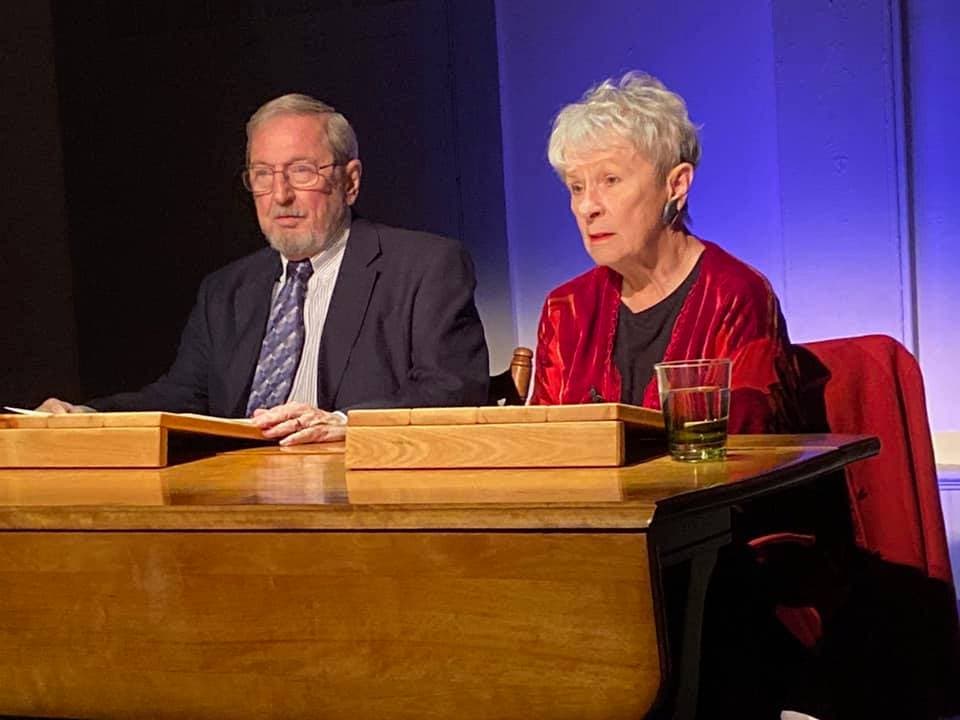 The Saturday performance was so well-attended that additional folding chairs had to be pulled out from beneath the actual stage and added to the end of the rows closest to it. The house had been flipped so that the duo of actors sat upon a small raised platform planted near the wall that would normally be house left in the Woodbury Historic Town Hall on Mountain Road.