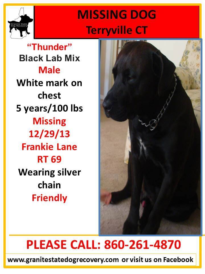 Missing Dog 'Thunder' from Terryville CT, missing since 12/29/13. Please call # with any SIGHTINGS.