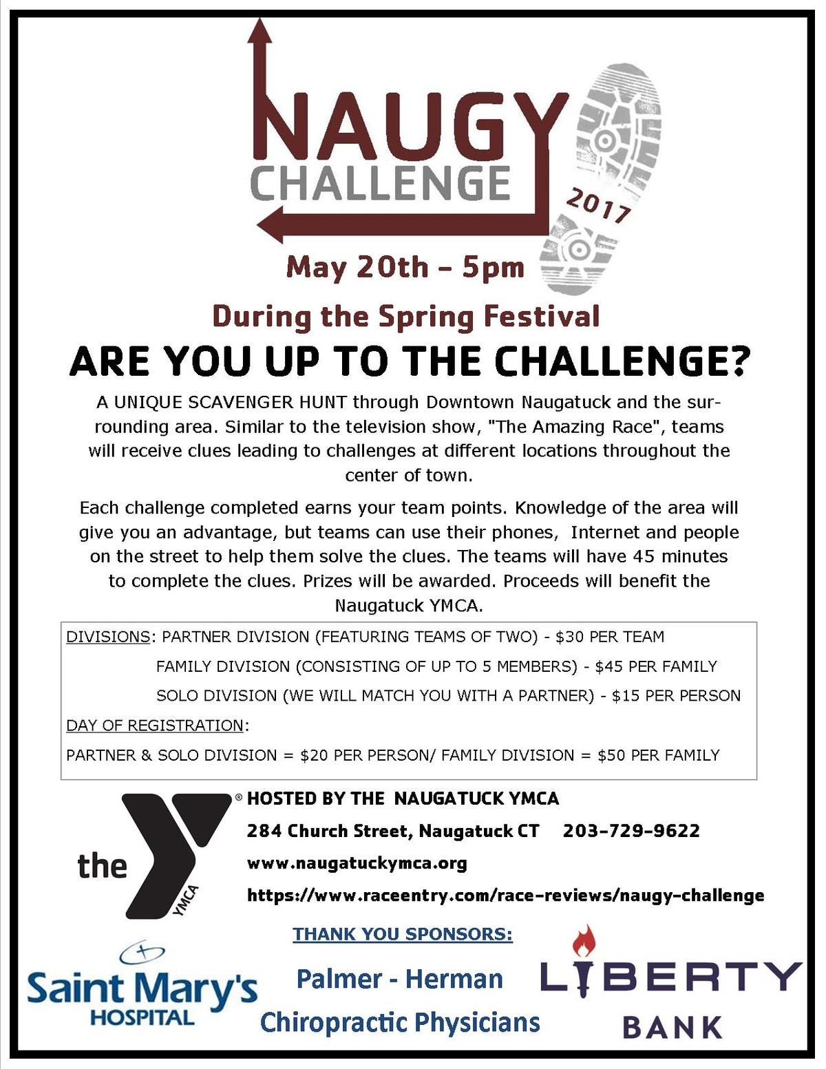 The Naugatuck YMCA announces the Naugy Challenge, a downtown Scavenger Hunt. A family friendly event in downtown Naugatuck.
