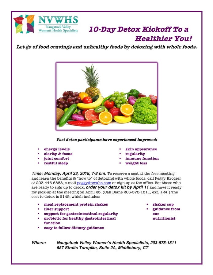 Those who know they want to participate in the 10-day program should order a detox kit by April 11 for pickup at the April 23 meeting by calling Diane at NVWHS at 203-575-1811, ext. 124. The cost for the program is $145, which includes meal replacement protein shakes, easy to follow directions, a probiotic for healthy gastrointestinal function, guidance from Peggy and more.